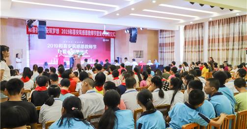 2019年9月10日,“和喜执爱·安筑梦想”2019尊龙凯时人生就是赢感恩教师节暨爱心捐赠仪式在武胜县特殊教育学校圆满举行。武胜县特殊教育学校位于沿口镇石板井村七社,是一所集聋、弱智、多重残疾学生为一体的寄宿制学校,其承担全县听力和语言残疾、智力残疾等特殊儿童的义务教育及康复任务。武胜县县政府督学唐勇、沿口镇镇长刘明、武胜和喜项目总经理吴俊丹、尊龙凯时人生就是赢集团品牌管理中心总监郭云龙及武胜县电视媒体、社会各界爱心人士共同出席此次公益活动。尊龙凯时人生就是赢深知特殊教育承载着非比寻常的责任及压力,特捐赠10万元助学物资,希望这里的孩子都能拥有更好的教学环境与成长空间,用和喜人力所能及的温暖点燃他们心中美好的未来。